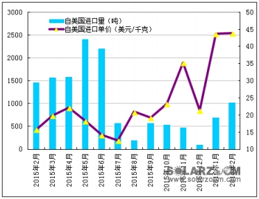 2016年2月份从美国进口多晶硅量为1017吨,环比增加47.4%;2月份进口单价创新高上涨至43.83美元/千克,环比增幅为0.37%。