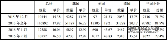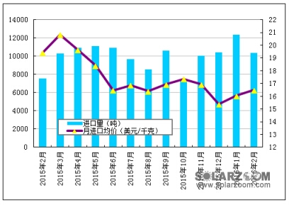 2016年2月份从德国进口多晶硅量为2310吨,环比减少33.4%;2月份进口单价创历史新低至15.51美元/千克,环比跌幅为0.19%。