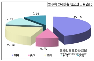 据分国别进口数据显示,2月份总进口量10372吨,同比增加37.2%,其中自韩国、美国、德国、台湾四个地区共进口多晶硅9344吨,占总进口量的90.1%。其中从韩国进口量为4700吨,占总进口量的45.3%;从美国进口量为1017吨,占总进口量的9.8%;从德国进口量为2310吨,占总进口量的22.3%;从台湾进口量为1317吨,占总进口量的12.7%;其他地区进口量为1028吨,占总量的9.9%。