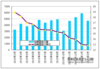 2016年2月份从韩国进口多晶硅量为4700吨,环比减少20.3%;进口单价再创历史新低至12.92美元/千克,环比下滑为5.4%。