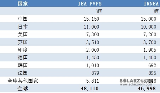 IEA PVPS和IRENA公布的2015年光伏新增装机数据
