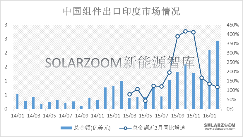 印度作为增长较快的新兴市场,IEA PVPS的报告显示印度2015年新增光伏装机量2GW,而根据IRENA公布统计数据这一数字为1.905GW,同比增长141%。印度市场的高增长早已从SOLARZOOM中国组件出口数据中得到了应证。根据SOLARZOOM组价出口数据,自2015年6月以来中国组件出口印度市场总金额近3月同比增长一直超过100%。