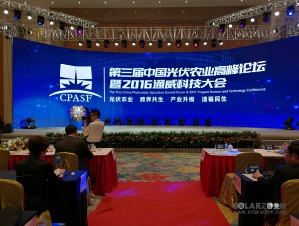 4月23日,第三届中国光伏农业高峰论坛暨2016通威科技大会在安徽合肥丰大国际大酒店隆重举行。本次会议由中国光伏农业产业技术创新战略联盟和通威股份有限公司联合主办,大会以“光伏农业,跨界共生,产业升级,造福民生”为主题,以提升中国光伏农业国际竞争力为目标,旨在打造资源整合、交流合作、项目投融资与推介的高端平台。中国农业部国际合作司原司长冯玉林,中国能源经济研究院常务副院长红炜,国家发改委国合中心能源研究所所长王进,中国科学院院士朱作言,中国工程院院士麦康森,中国光伏农业产业技术创新战略联盟秘书长张勇,十一届全国政协常委、通威集团董事局主席刘汉元、阳光电源股份有限公司董事长曹仁贤等行业权威出席本次盛会并作主题报告。来自国内外光伏、农业领域的领军企业家、专家学者、投资与招商机构代表等700余人共同参与并见证了光伏农业交流融合的历史性时刻。