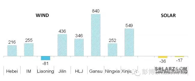 图:保障性利用小时数估算结果与2015年实际利用小时数差值