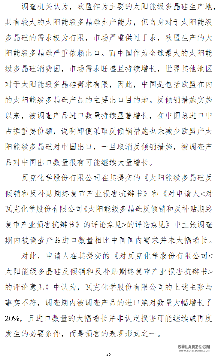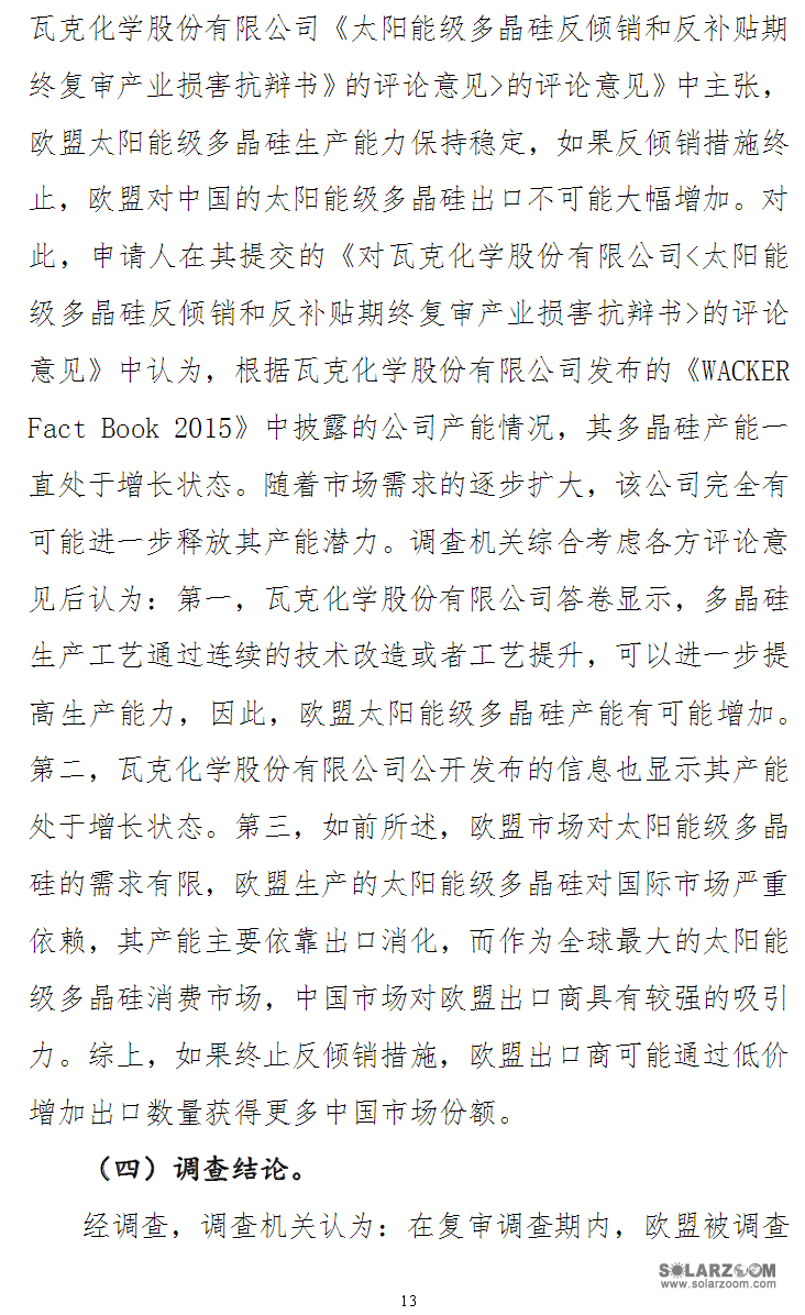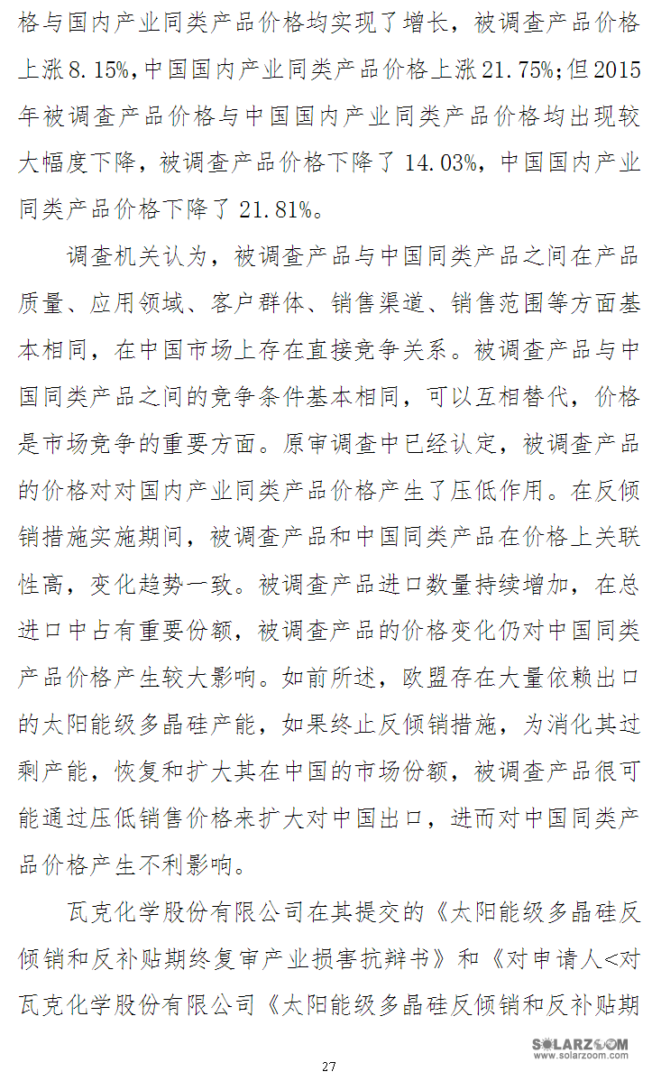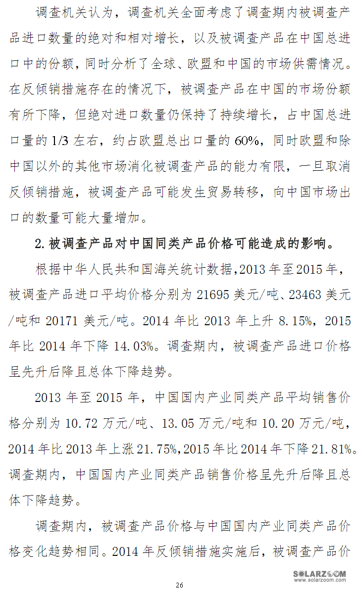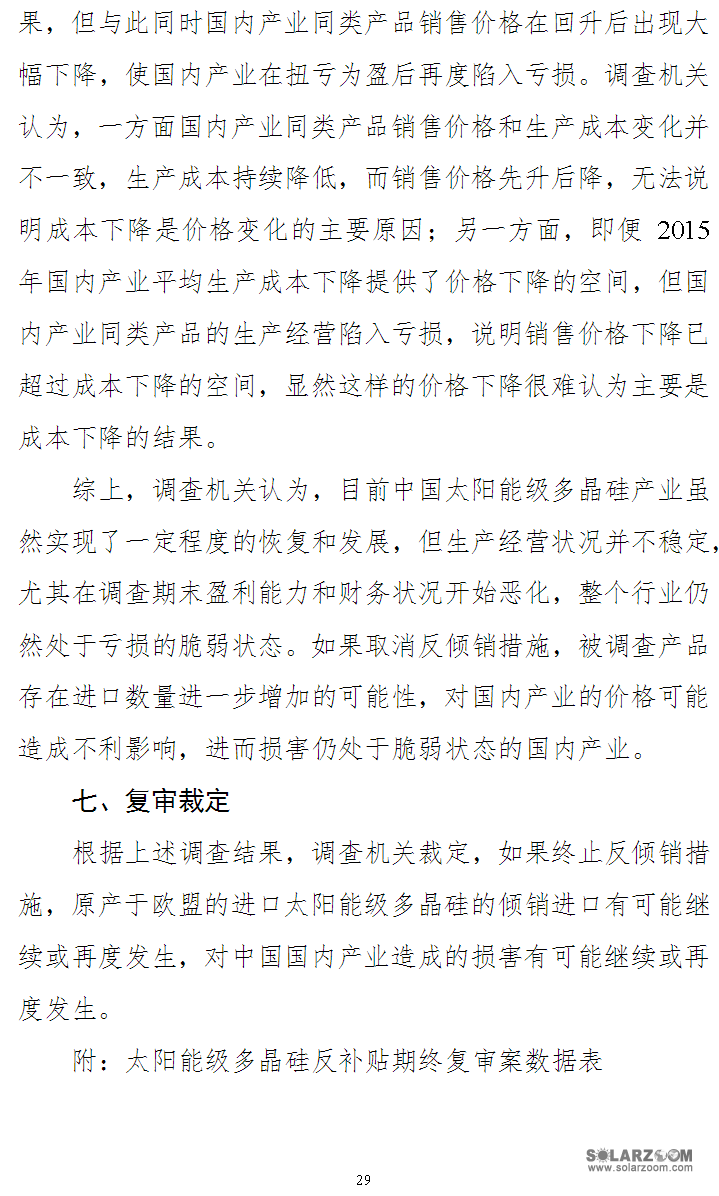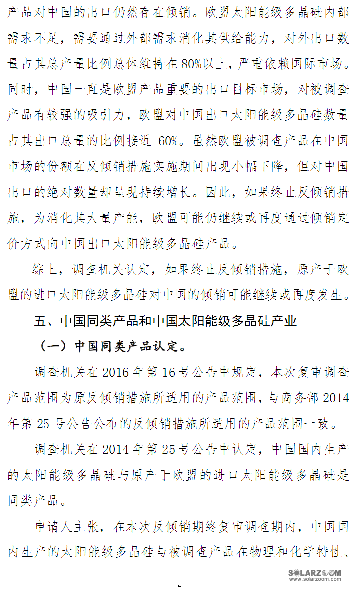 调查机关裁定,如果终止反倾销措施,原产于欧盟的进口太阳能级多晶硅对中国的倾销可能继续或再度发生;原产于欧盟的进口太阳能级多晶硅对中国太阳能级多晶硅产业造成的损害可能继续或再度发生。