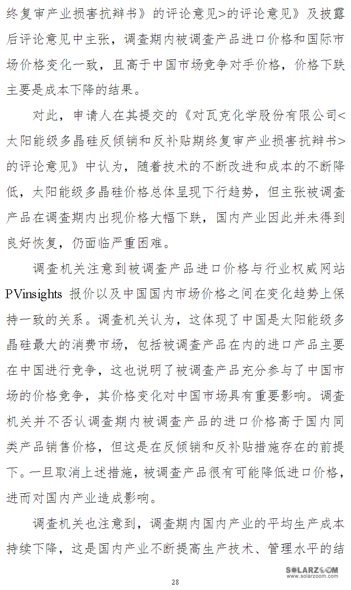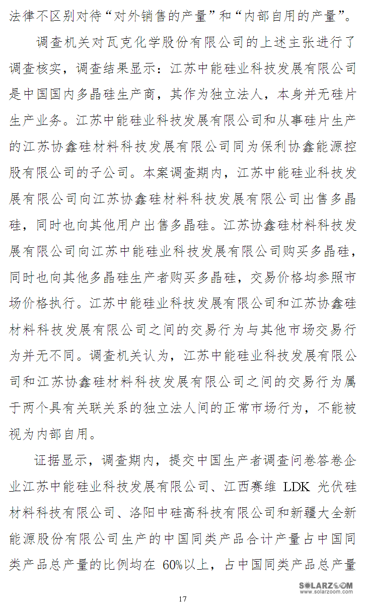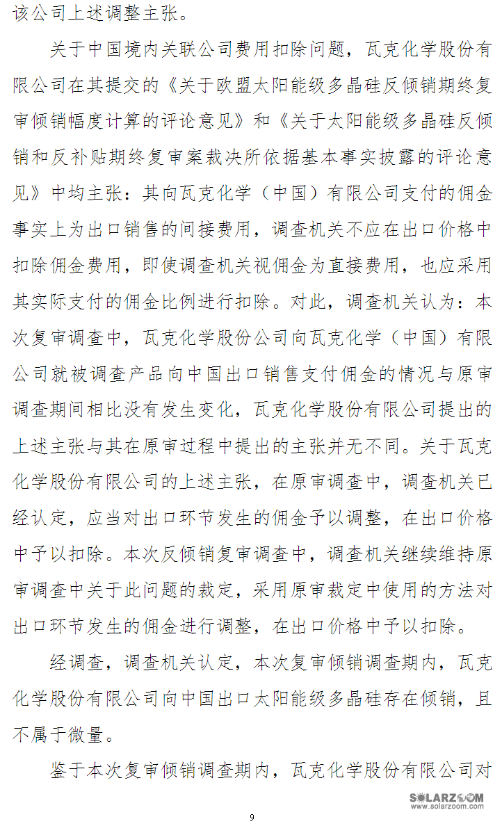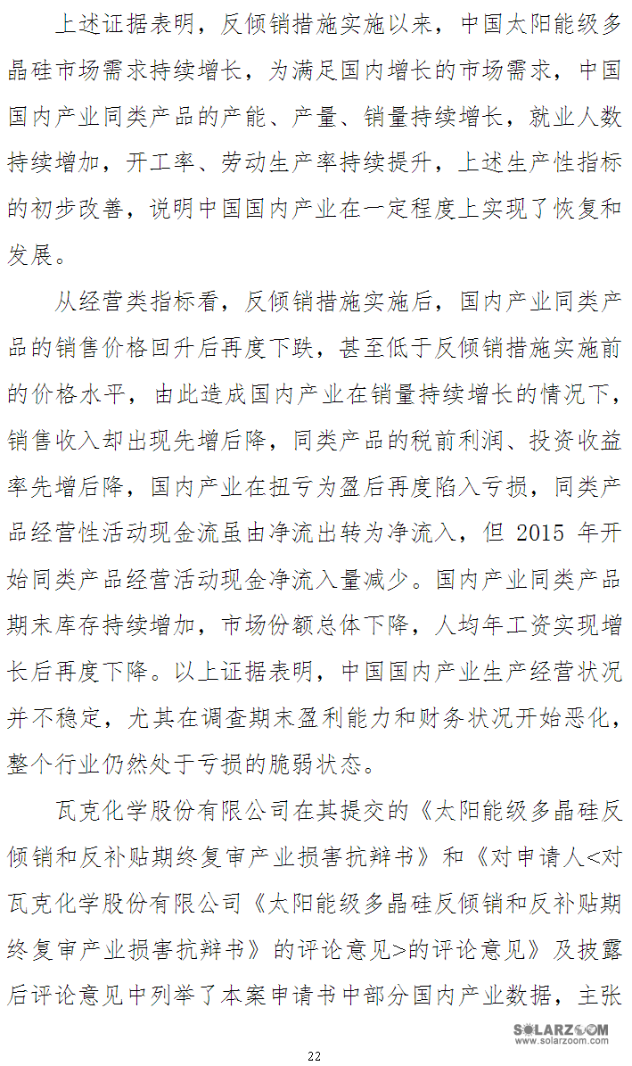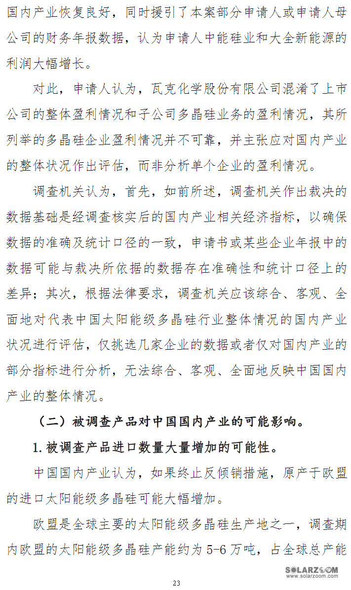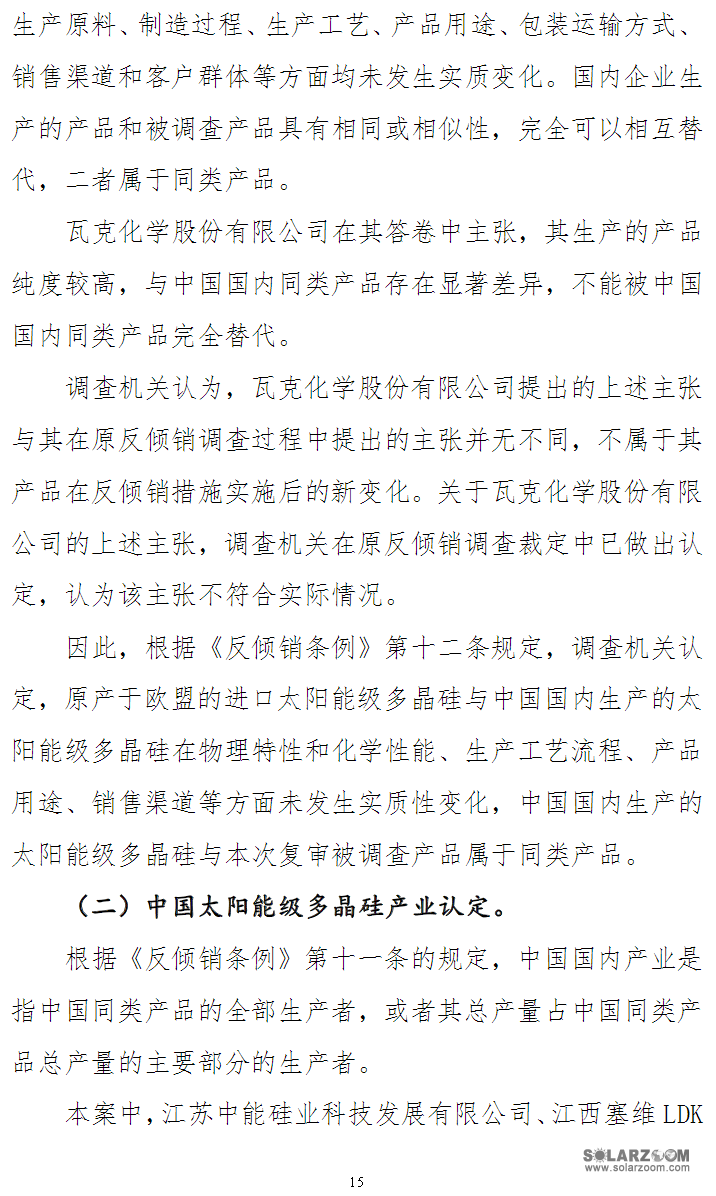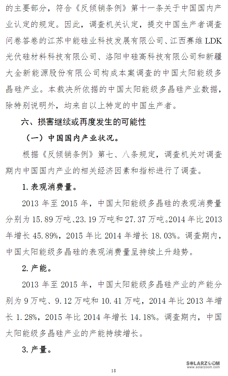 调查机关裁定,如果终止反倾销措施,原产于欧盟的进口太阳能级多晶硅对中国的倾销可能继续或再度发生;原产于欧盟的进口太阳能级多晶硅对中国太阳能级多晶硅产业造成的损害可能继续或再度发生。