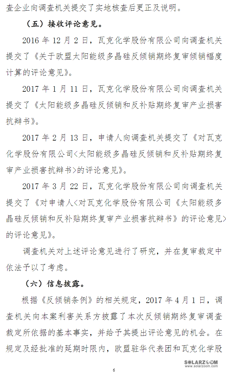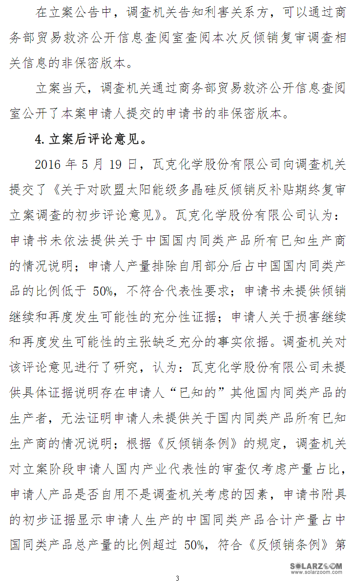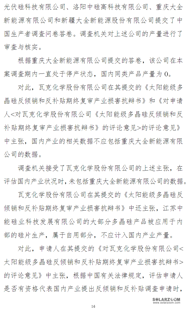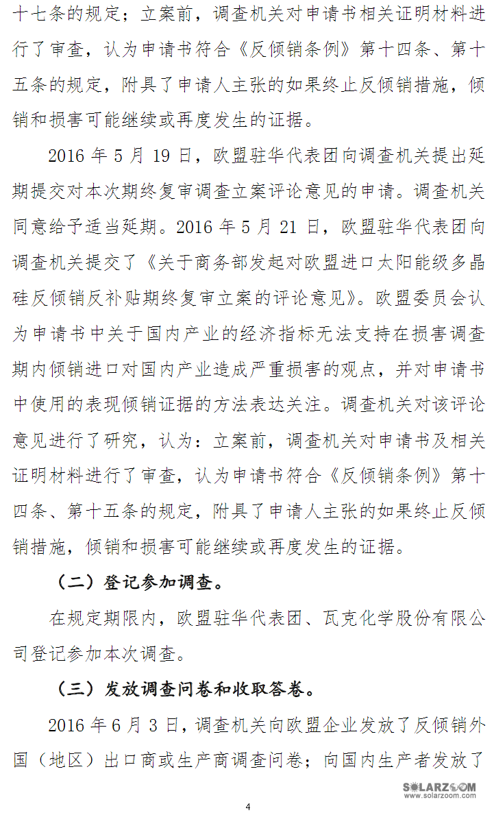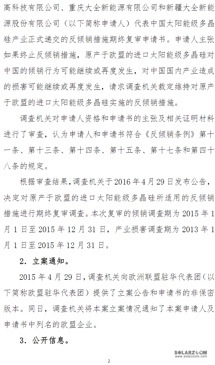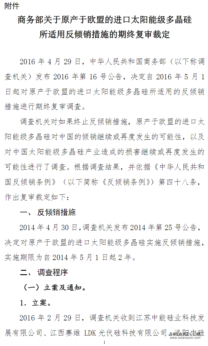 2016年4月29日,应中国太阳能级多晶硅产业的申请,调查机关发布2016年第16号公告,决定对原产于欧盟的进口太阳能级多晶硅所适用的反倾销措施进行期终复审调查。