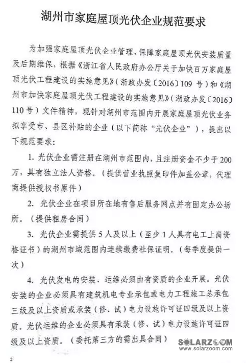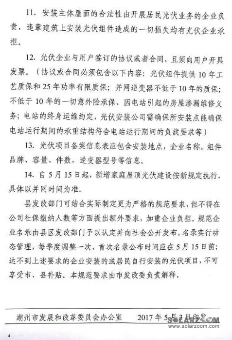 近日,浙江省湖州市发改委出台了《关于湖州市家庭光伏企业规范要求》的通知,力推家庭光伏朝向更规范的方向发展。通知共涉及14条具体要求,堪称户用光伏史上最严格的规范。