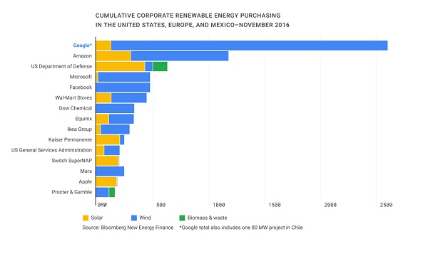 (图说:截至2016年11月为止,Google在欧、美及墨西哥自投入绿电购买以来,累积购买的绿电量(MW)占排名第一,其中以风力占最大宗。来源:Bloomberg)