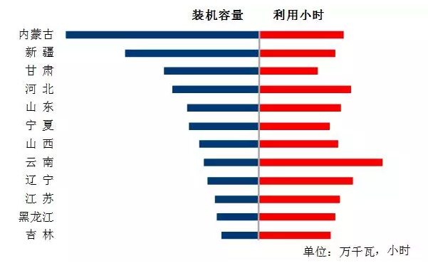 图6 1-7月份风电装机较多省份风电装机容量和设备利用小时