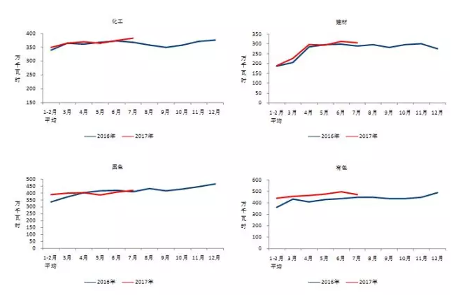 7月份,四大高载能行业用电量合计1579亿千瓦时,同比增长4.6%,增速比上年同期提高4.0个百分点,占全社会用电量的比重为26.0%。其中,化工行业用电量384亿千瓦时,同比增长5.7%,增速比上年同期提高4.8个百分点;建材行业用电量305亿千瓦时,同比增长5.9%,增速比上年同期提高0.7个百分点;黑色金属行业用电量418亿千瓦时,同比增长1.3%,增速比上年同期提高5.9个百分点;有色金属冶炼行业473亿千瓦时,同比增长5.9%,增速比上年同期提高3.5个百分点。