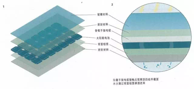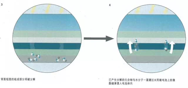 国外有文章指出蜗牛纹的出现与水汽有关,尤其是从背板透过的水汽,通过EVA胶膜后从隐裂处渗过,在电池片表面富集,造成银浆氧化,形成黑色纹路。具体推演请参考如下内容: