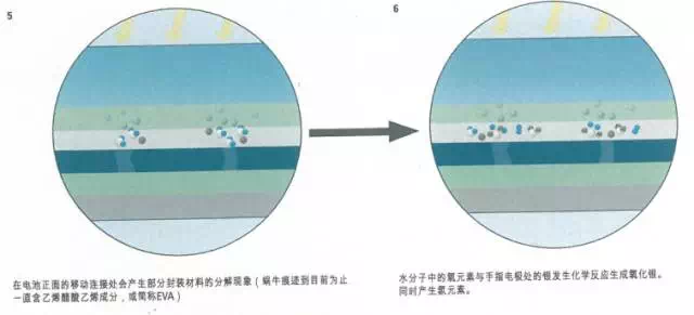 基于以上描述,研究人员将隐裂的电池片层压,不用背板封装,将组件放入湿热老化箱中,无法重现蜗牛纹,可见蜗牛纹的出现不仅仅与水汽的单方面作用有关,故而可以推断,其与EVA的关系较大。