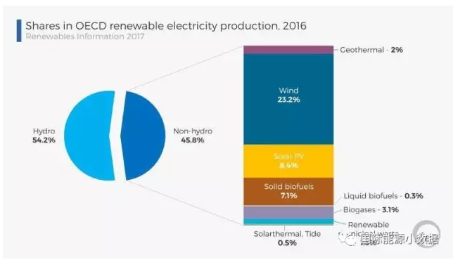 如果单看2016年可再生能源发电量的构成,水电占54.2%,其次是风电(23.2%)、太阳能光伏(8.4%)、固体生物燃料(7.1%)、沼气发电(3.1%)、地热(2%)、市政垃圾(1.3%)、其他(0.8%)。