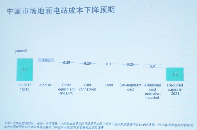 中短期市场看,金刚线多晶片的需求持续扩大推动降本,供货能力提升,多晶组件价格有望在2.7-2.8价位基础上平稳下降。近期因为单晶硅片龙头厂检修、瓦克美国工厂爆炸事故影响硅料进口,市场单晶硅片均价上调到6 - 6.2元/片,短期内单晶组件在3元/瓦以上仍上扬。展望四季度甚至2018年初,整个国内、外市场需求都会下降。从11月开始,美国201调查、印度对华光伏“双反”、日本FIT的调整,总体需求可能大幅下跌;国内方面,11月底今年能并网的项目基本都完成了组件发货,明年初价格可能会跳水。未来数年,根据彭博新能源财经数据,2021年中国地面电站总体成本将从当前6.2元/瓦下降到3.5元/瓦,组件成本会下降到2元以下。