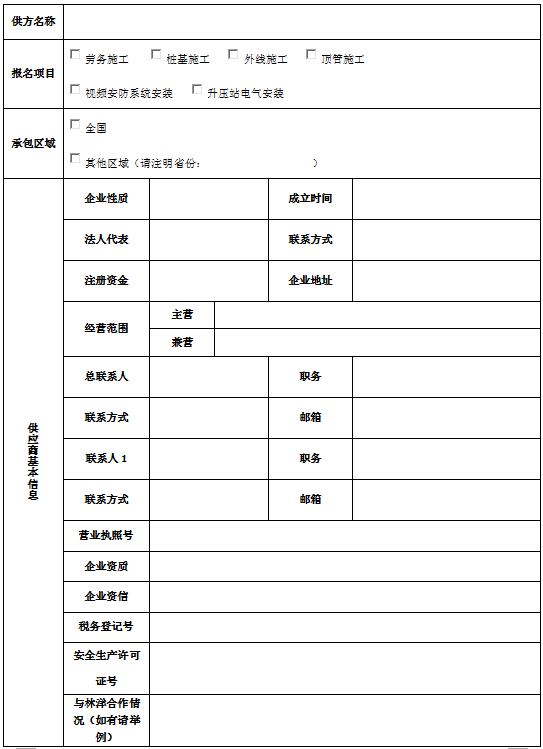 欢迎您来到江苏林洋新能源科技有限公司,为我公司工程提供产品或寻求合作。为了更加深入和更快熟悉贵公司(或贵方产品),希望您如实填写《供方基本信息登记表》及相关附件,并按清单要求及清单顺序整理汇总成一个PDF文件(PDF电子版一并提供),以便于我司的电子信息化录入,请不要改变其格式。