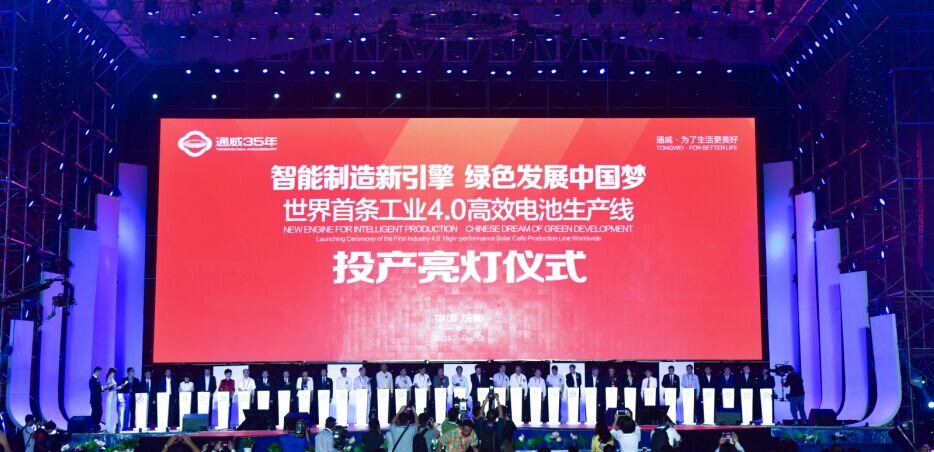 9月20日,以“智能制造新引擎,绿色发展中国梦” 为主题的世界首条工业4.0高效电池生产线投产仪式暨通威35年庆隆重举行。