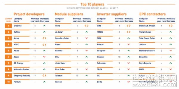 Greenko与ReNew Power两家公司仍旧是表中安装量最多的两家开发商,Acme公司位列第三。Bridge to India的太阳能地图指出,目前印度市场上已有7家开发商拥有超过1GW的项目组合,其中包括已调试运行的项目和储备项目。