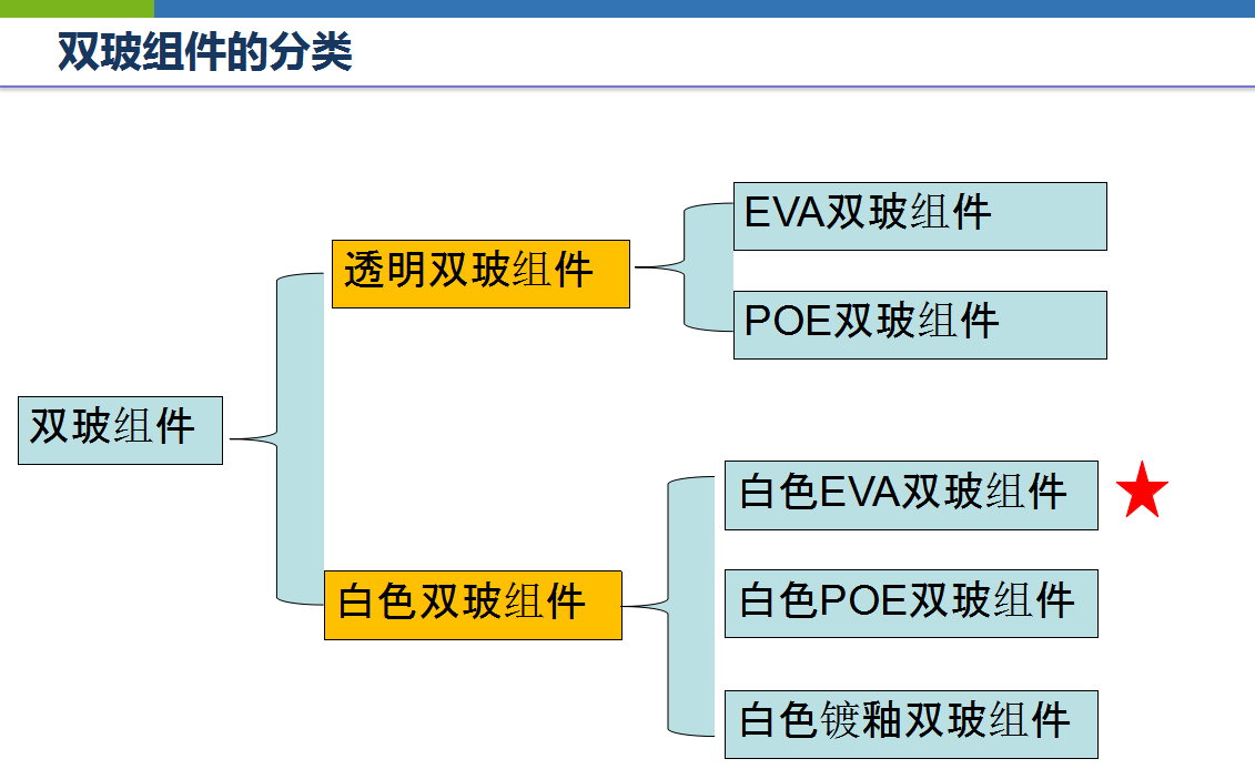双玻组件大家都很熟悉,在现实中也有很广泛的应用。双玻组件目前分为透明双玻组件和白色双玻组件。透明双玻组件分为EVA双玻组件和POE双玻组件;而白色双玻组件分为白色EVA双玻组件、白色POE双玻组件、白色镀釉双玻组件三种。