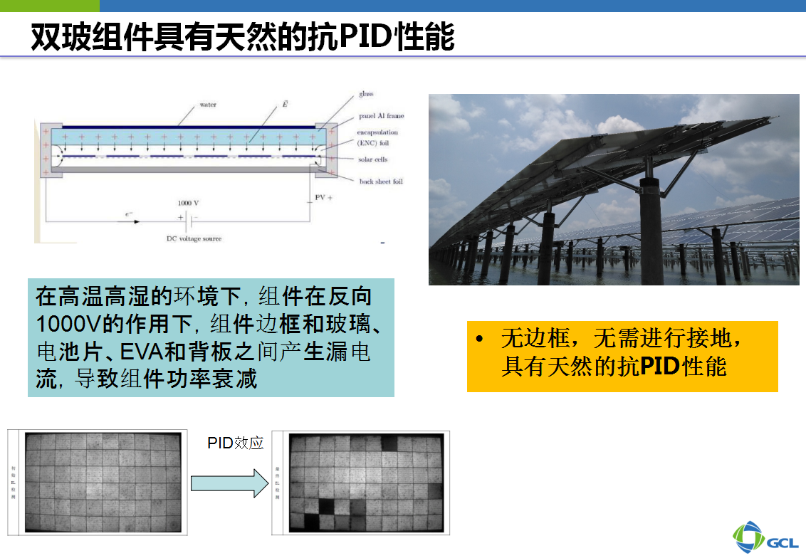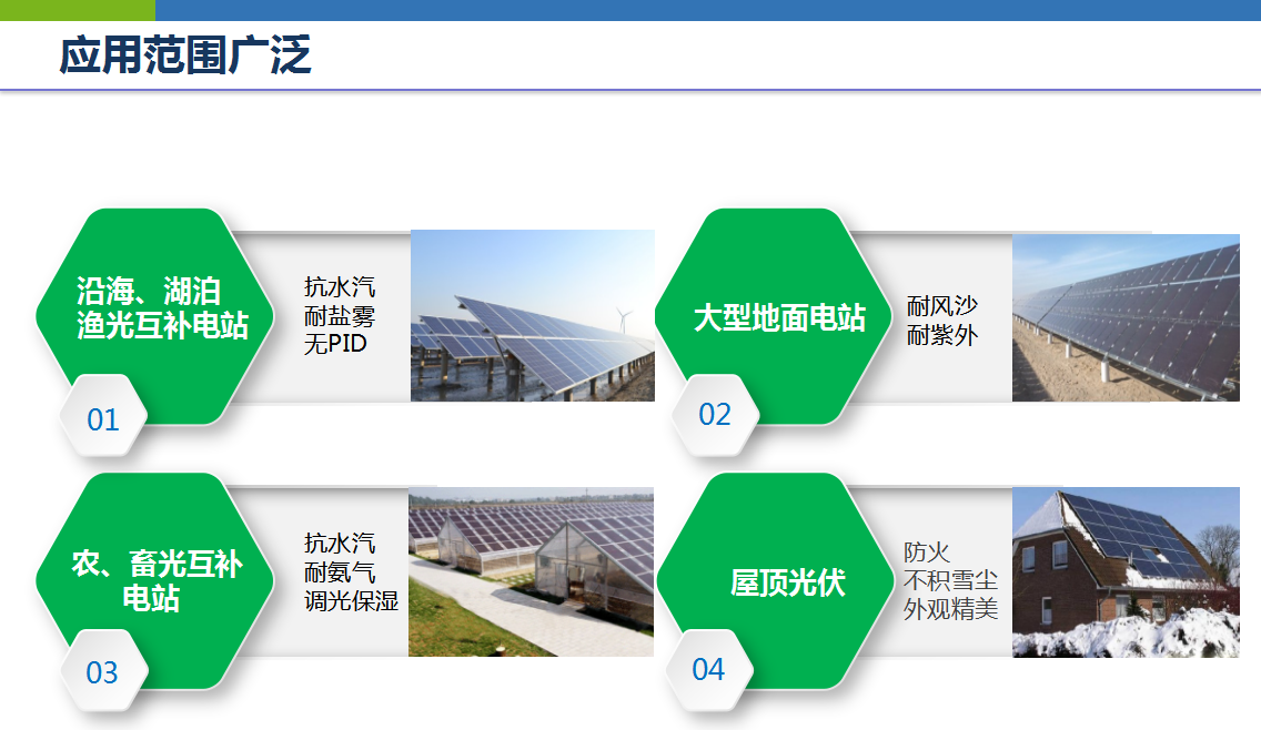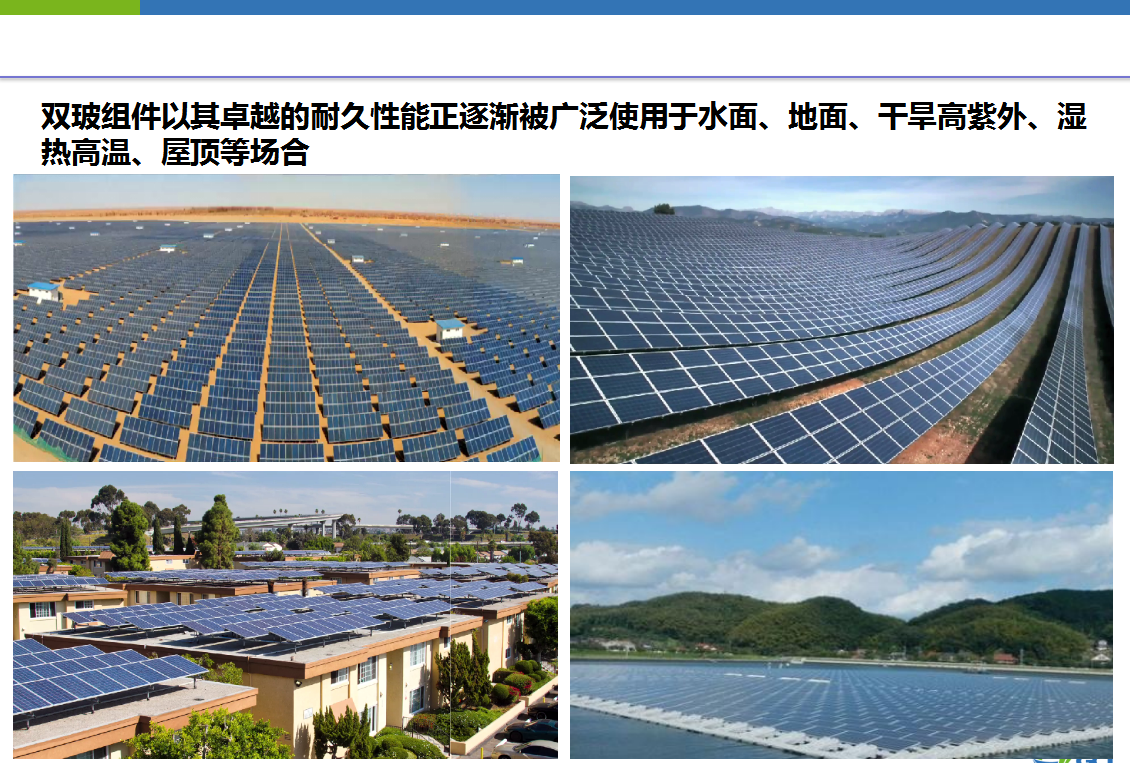 目前,双玻组件以其卓越的耐久性能正逐渐被广泛使用于水面、地面、干旱高紫外、湿热高温、屋顶等场合。我们期待白色双玻组件在日后的电站安装中有更高的比例。我的报告就到这里,谢谢大家!
