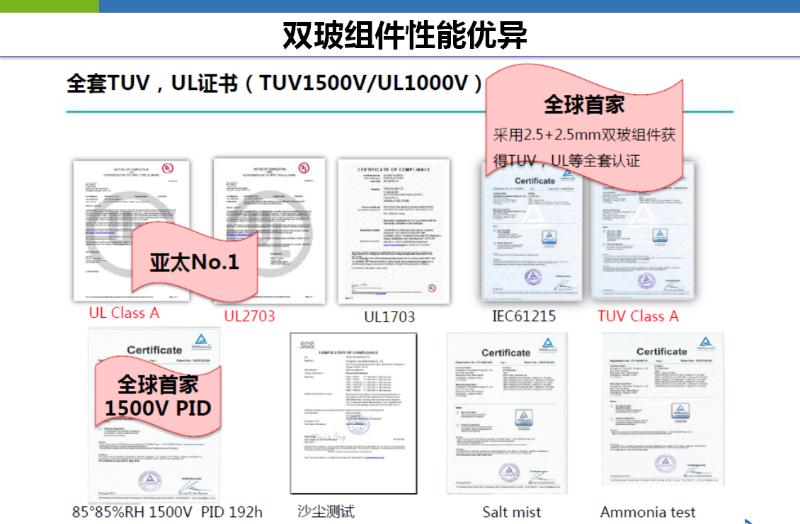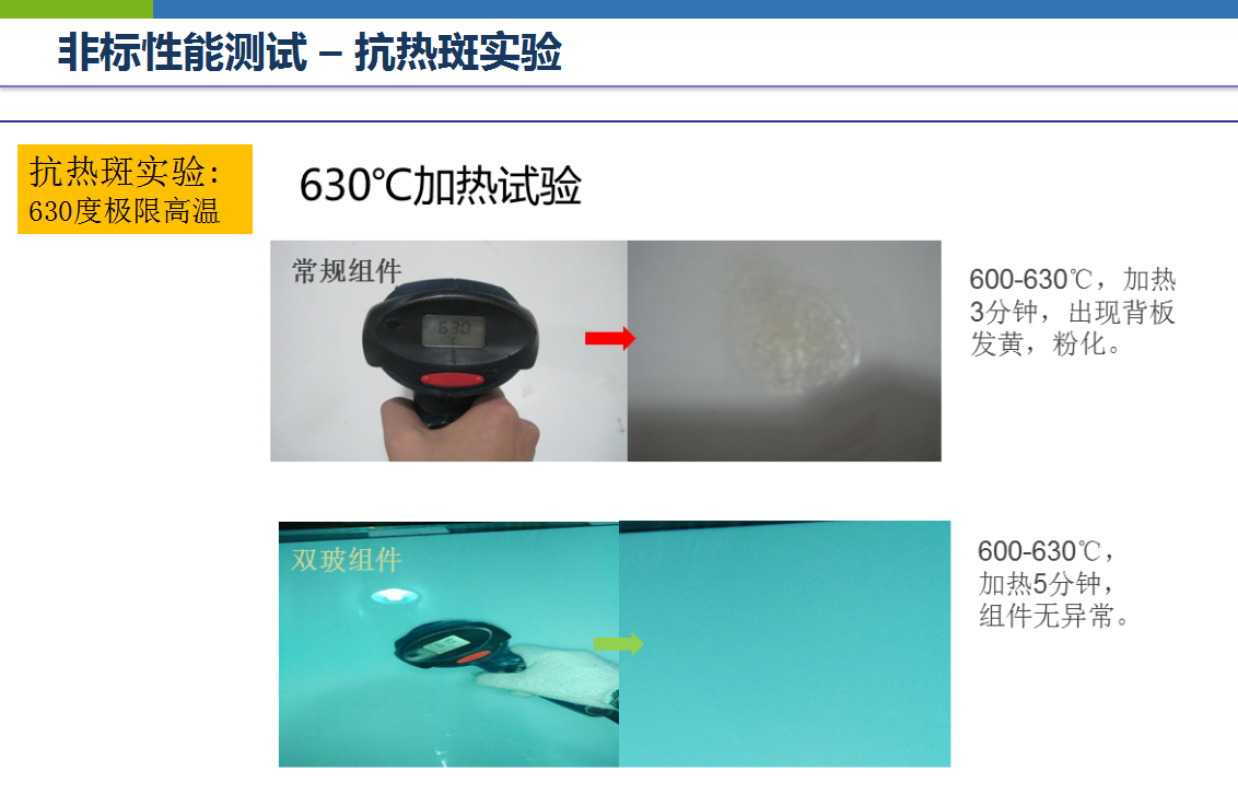 除了上述非标性能测试外,双玻组件还通过了防火等级测试、第三方3XIEC加严测试、3倍IEC测试等多项测试。