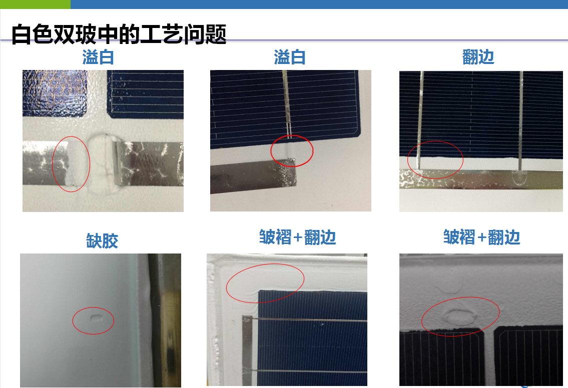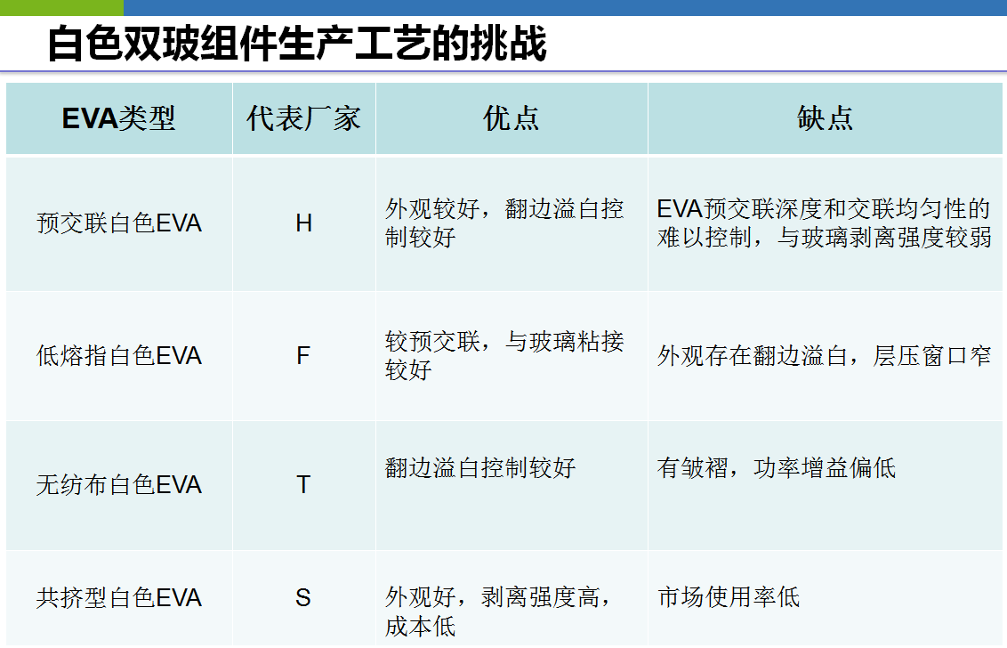白色双玻的EVA类型可分为:预交联白色EVA、低熔指白色EVA、无纺布白色EVA、共挤型白色EVA,但在生产过程中容易出现溢白、翻边、皱褶等工艺问题,因此在购买时需要选择生产实力较好的厂家。