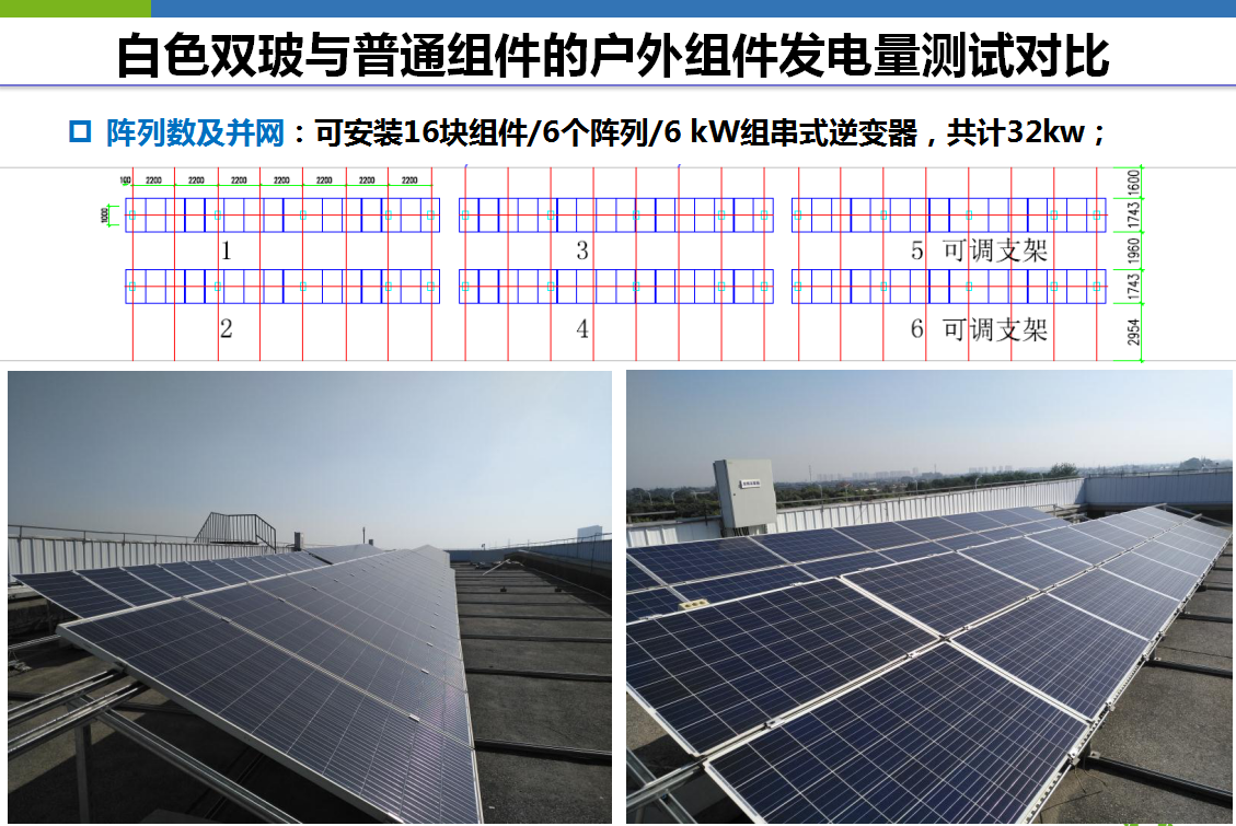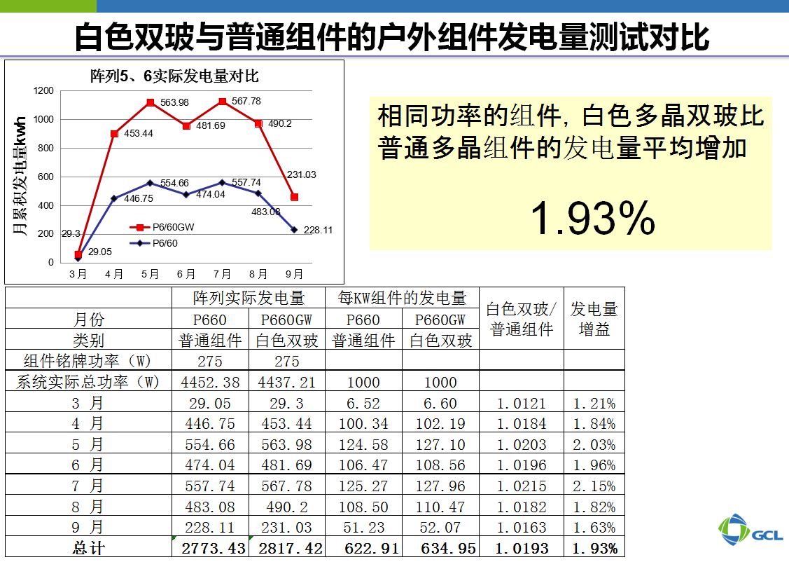 在白色双玻与透明双玻及普通组件的户外发电量测试对比试验中,白色双玻组件也均处领先地位。相同功率的组件,白色多晶双玻比普通多晶组件的发电量平均增加1.93%。
