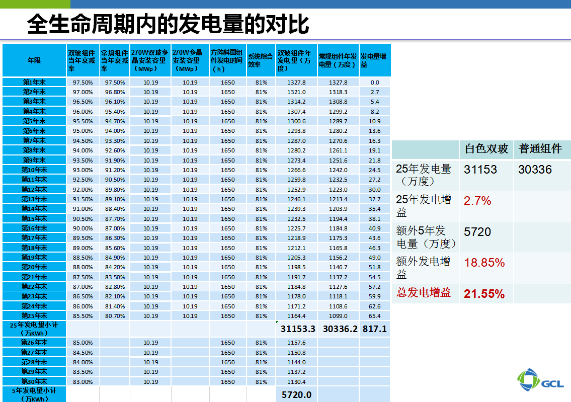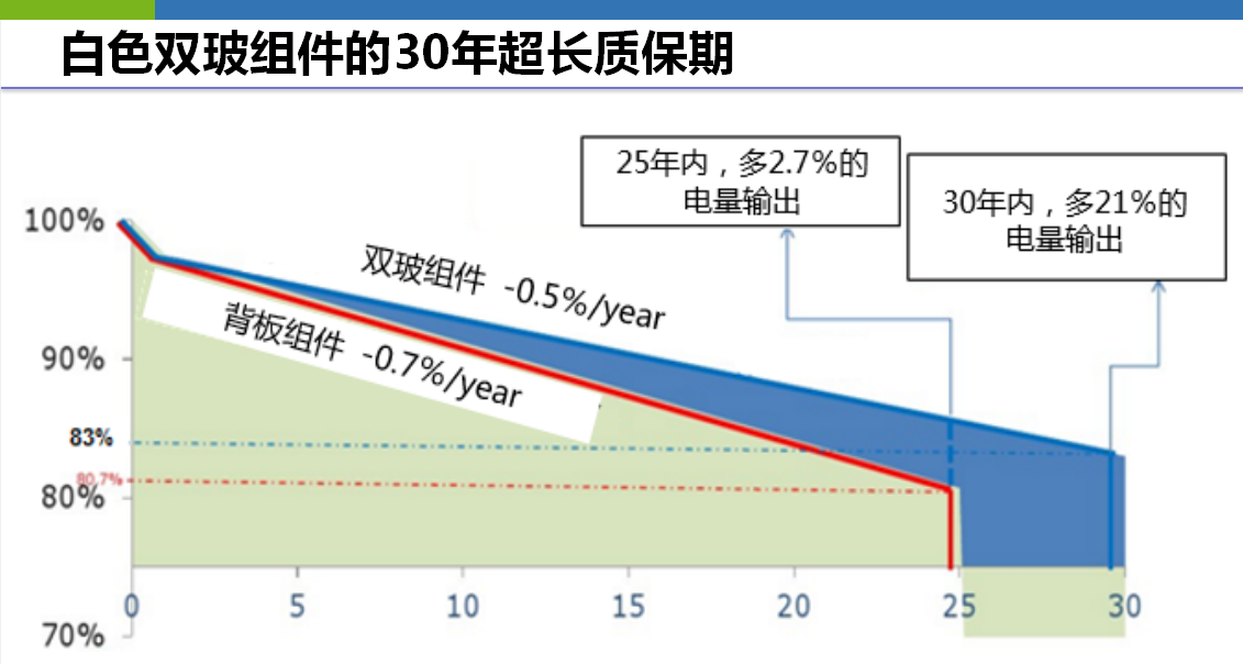 在全生命周期内的发电量对比中,白色双玻比普通组件在25年发电增益上增加2.7%,且白色双玻组件具有30年的超长质保期。