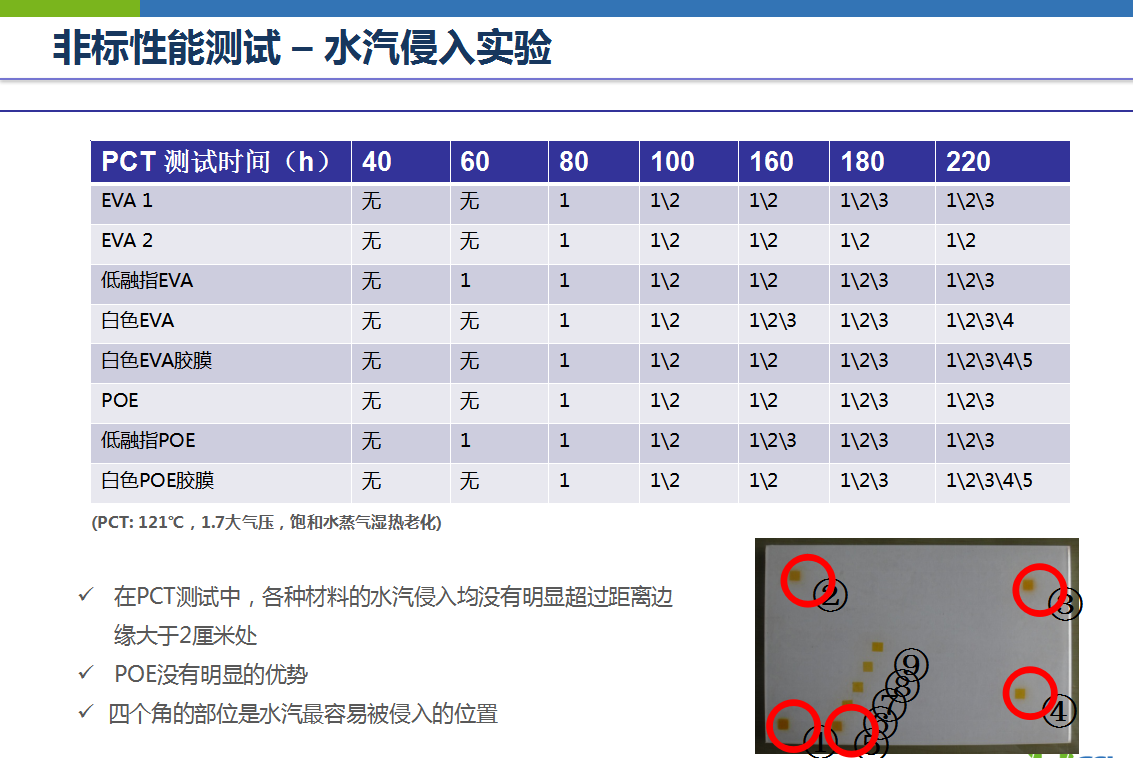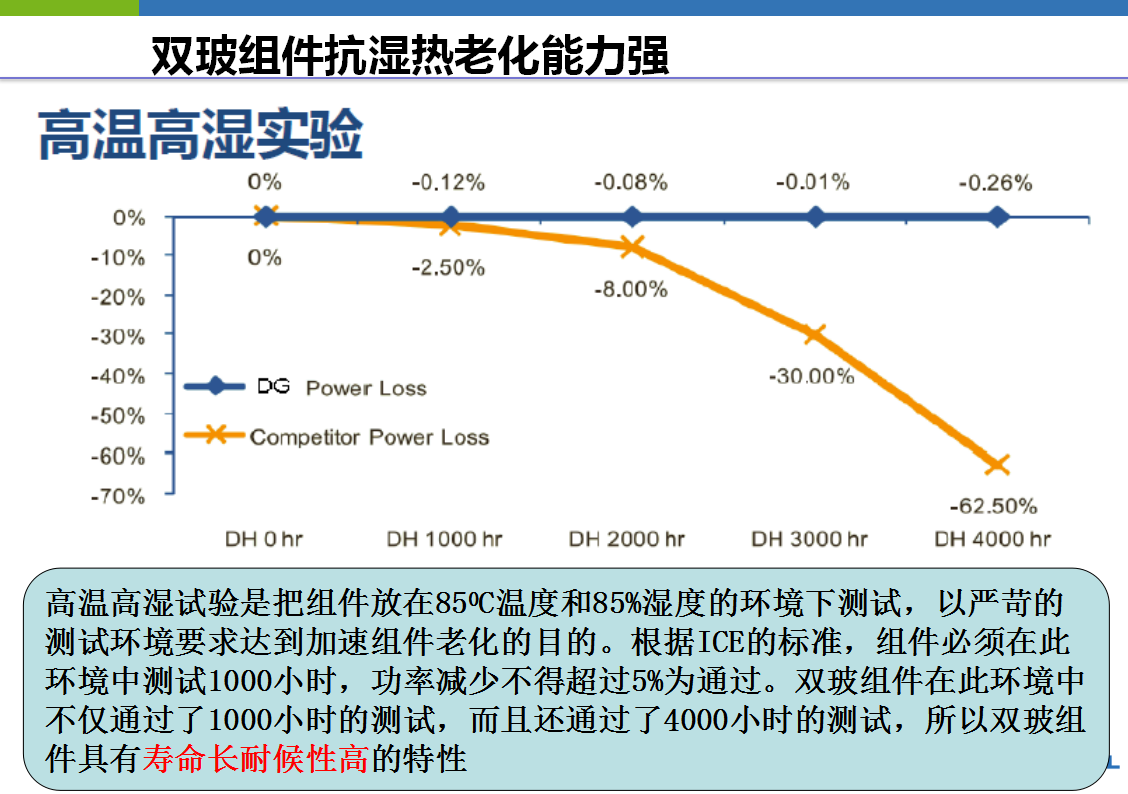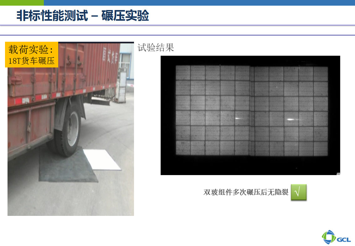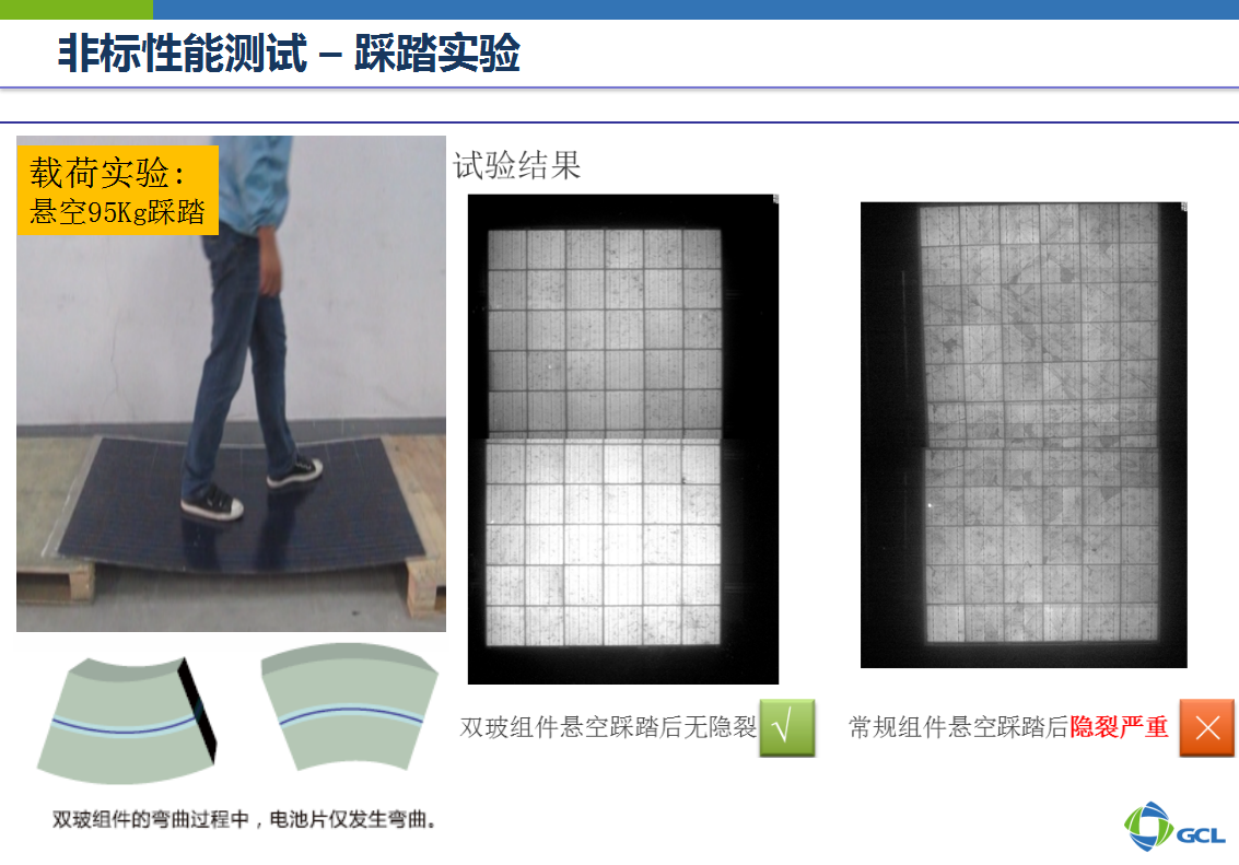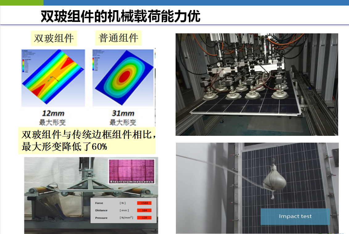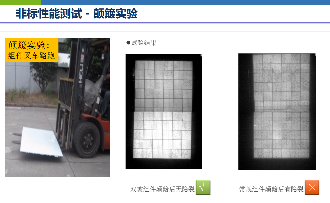 在一些非标性能测试(如颠簸实验、载荷实验、抗热斑实验、水汽侵入实验)中,双玻组件比常规组件更具优势。具体实验数据下图。