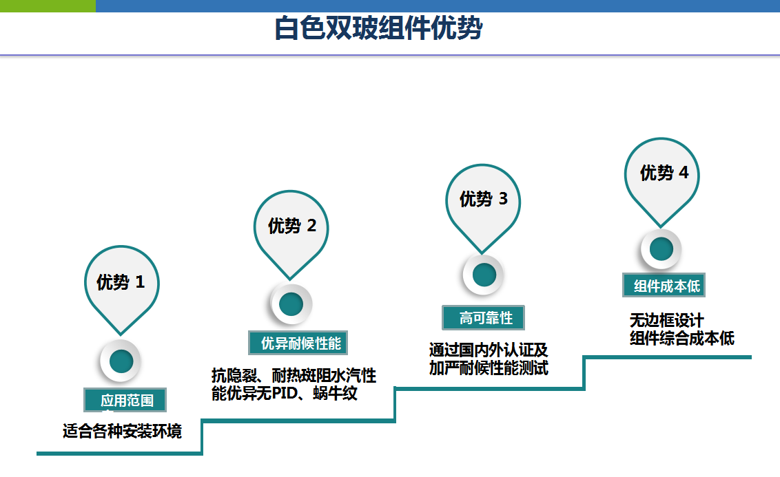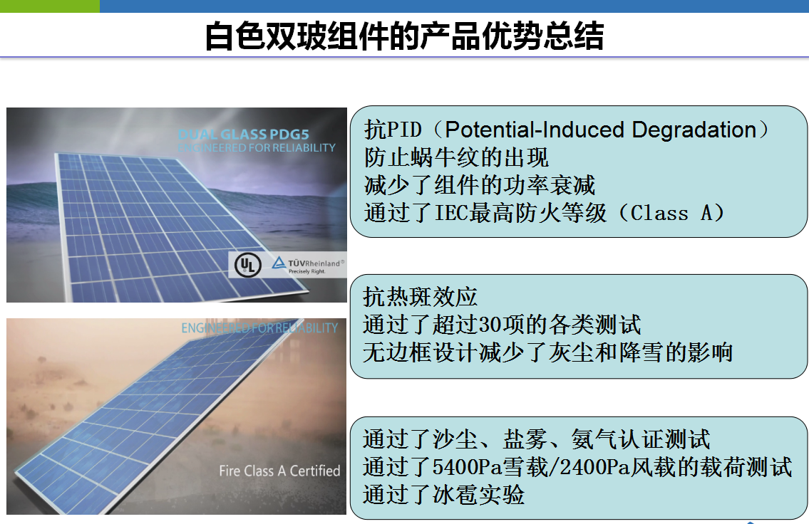 综上,白色双玻具有抗PID、抗热斑效应、减少组件功率衰减、防火等级高等多项优势。
