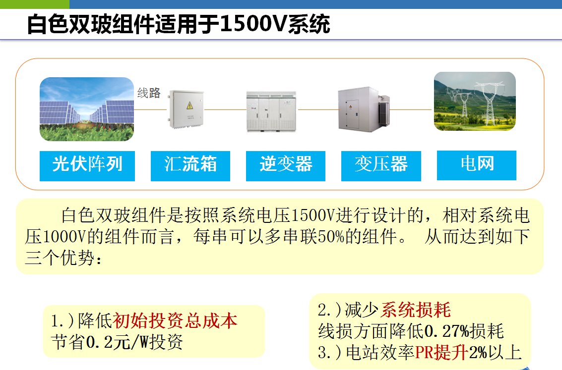 白色双玻组件是按照系统电压1500V进行设计的,相对系统电压1000V的组件而言,每串可以多串联50%的组件。 从而达到如下三个优势:一、降低初始投资总成本,节省0.2元/W投资;二、减少系统损耗,线损方面降低0.27%损耗;三、电站效率PR提升2%以上。