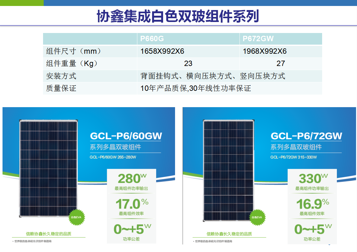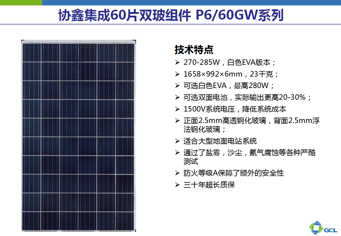 这是我们协鑫集成推出的一款60片的双玻组件,适合大型地面电站系统,通过了盐雾,沙尘,氨气腐蚀等各种严酷测试,防火等级达到A级,三十年超长质保。