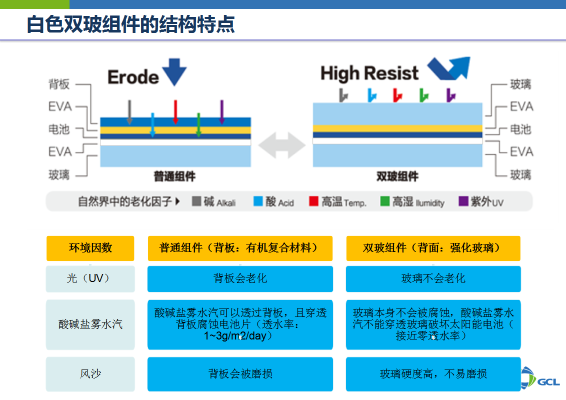 以白色EVA组件为例,它的结构从上到下为2.5mm玻璃、透明EVA、电池片串阵、白色EVA、2.5mm玻璃五层,普通组件结构的不同之处在于只有一层玻璃,另一层为背板,而背板本身会存在老化、衰减等问题,从而导致电池片的磨损。双玻组件因为是双层玻璃,因此具有耐水汽、耐腐蚀、耐风沙等优点。
