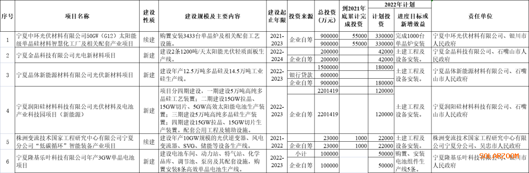 4月11日,宁夏发改委发布《2022年自治区重点项目投资计划》,涉及光伏重点项目为6个制造业项目、17个重点光伏发电建设项目,规模为3.425GW。