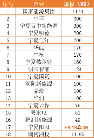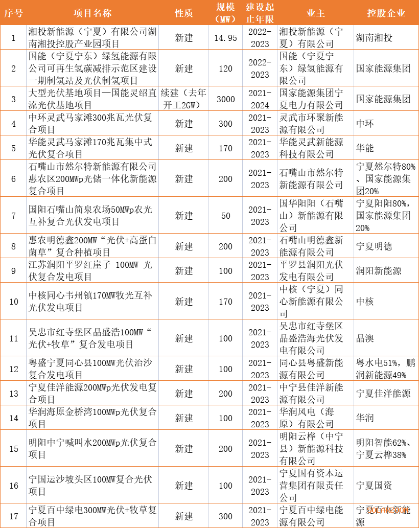 在光伏电站项目方面,17个项目包括3个重点项目、14个2022年光伏竞争性配置项目。根据业主梳理情况来看,国家能源集团规模超过1GW,中环、宁夏百中新能源各300MW。