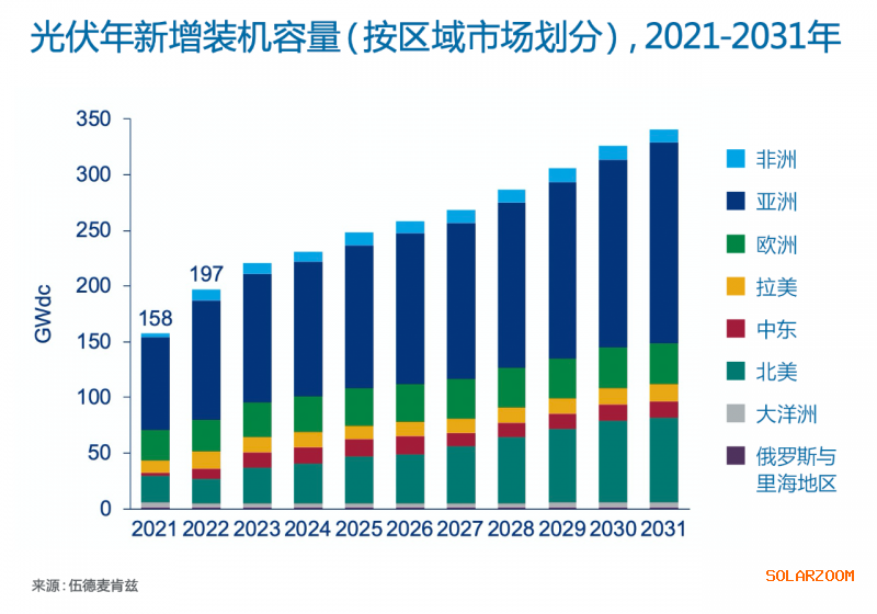 伍德麦肯兹预计2022年,全球光伏市场年新增装机容量将同比增长25%,实现197GW,累计装机容量将突破1,000GWdc大关。2022-2031年,全球光伏并网装机容量将以年均8%的速度增长。