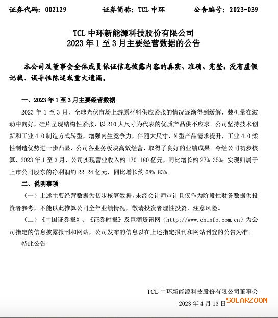 公告表示,2023年1至3月,全球光伏市场上游原材料供应紧张的情况逐渐得到缓解,装机量在波动中向好,硅片呈现结构性紧张,以210大尺寸为代表的优质产品供不应求。公司坚持技术创新和工业4.0制造方式转型,增强内生竞争力,伴随大尺寸、N型产品需求提升,工业4.0柔性制造优势进一步凸显,公司各业务板块高效经营,取得了良好的业绩成果。今经公司初步核算,2023年1至3月,公司实现营业收入约170-180亿元,同比增长约27%-35%;实现归属于上市公司股东的净利润约22-24亿元,同比增长约68%-83%。