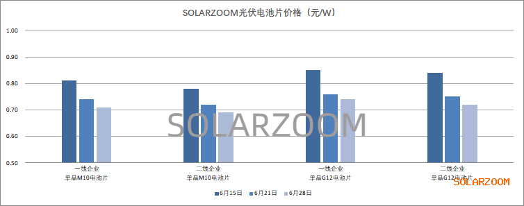 端午节后国内单晶电池片价格仍处于下跌中,但下跌幅度收窄。本周国内单晶M10高效电池价格已来至0.7元/W左右,本周单晶高效M10主流价格在0.69-0.71元/W,贸易商出货价格出现0.65-0.68元/W区间的价格;单晶G12高效电池价格下跌至在0.72-0.74元/W区间。本周国内主流电池企业继续维持高开工率生产,部分电池企业也基本靠代工维持满产中,近期国内单晶电池的整体产出处于增加中,而下游组件端仍多以消纳库存为主的情况下,对电池端需求、提货有所放缓,因此国内的电池端的库存出现不减反增的趋势。N型电池方面,N型电池继续随P型电池下跌而下跌,Topcon电池价格下跌至0.76-0.78元/W左右;HJT电池价格外销依然较少,价格相比P型M10组件价格有0.2元/W左右的溢价,本周HJT电池价格开始跌破1元/W,价格在0.92元/W左右。