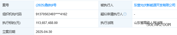 此前,2025年4月30日,东营光伏新能源开发有限公司被山东省高级人民法院列为被执行人,执行标的为113,657,488.00元,案号为(2025)鲁执9号。