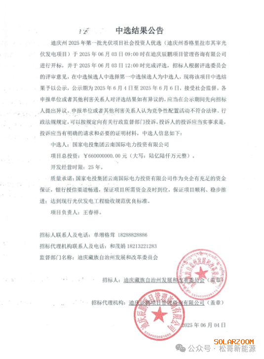 6月4日,云南迪庆州2025年第一批光伏项目投资人中选结果公告发布,此次公示的两个项目分别国家电投集团云南国际电力投资有限公司、华能澜沧江水电股份有限公司获得。