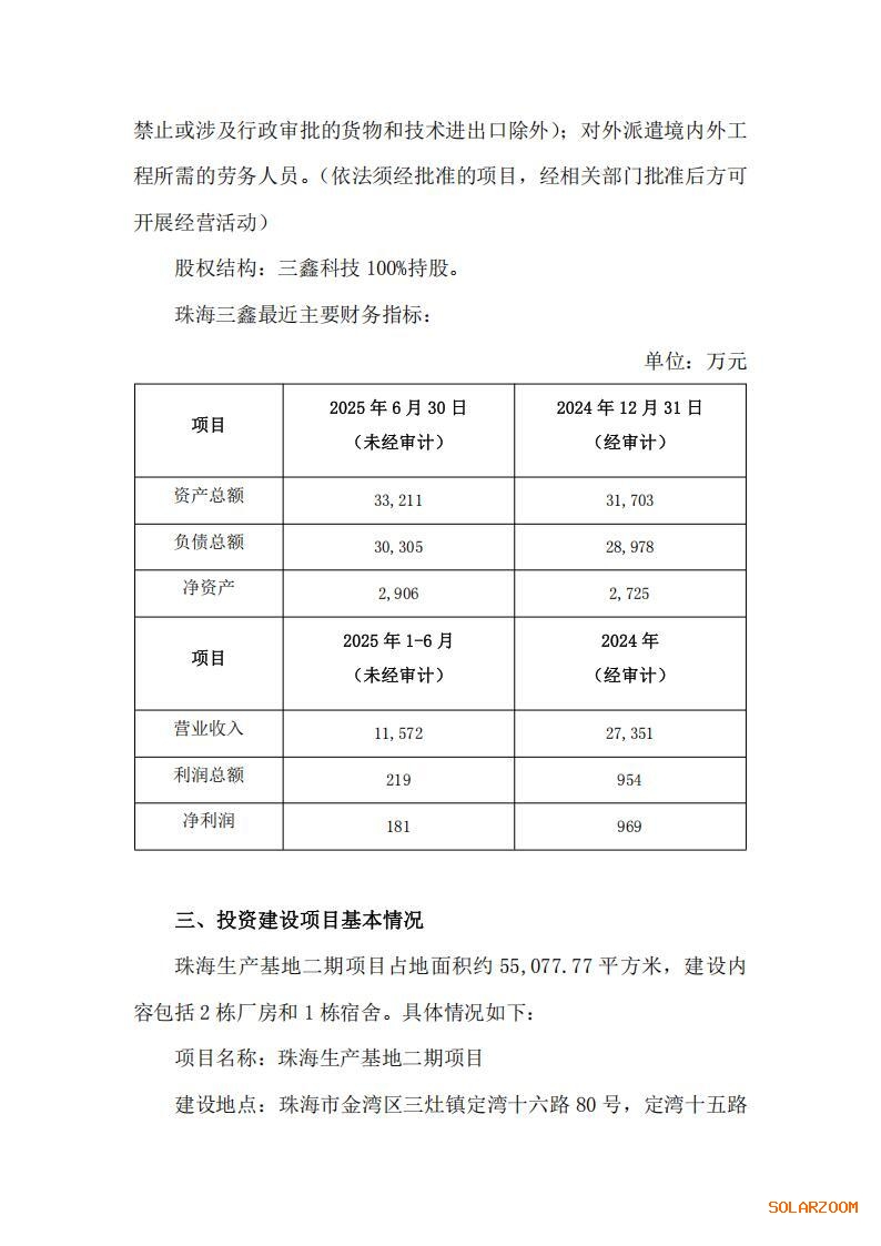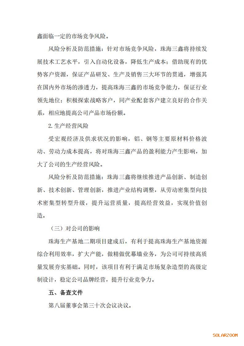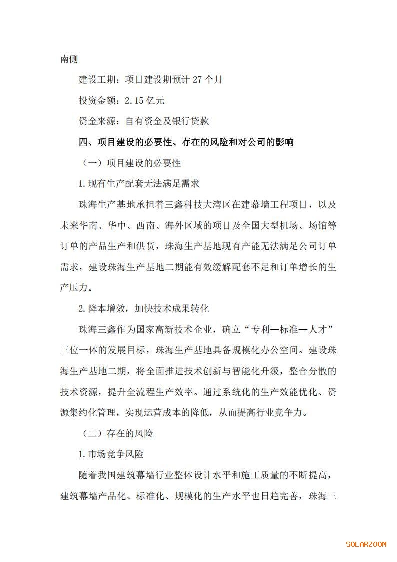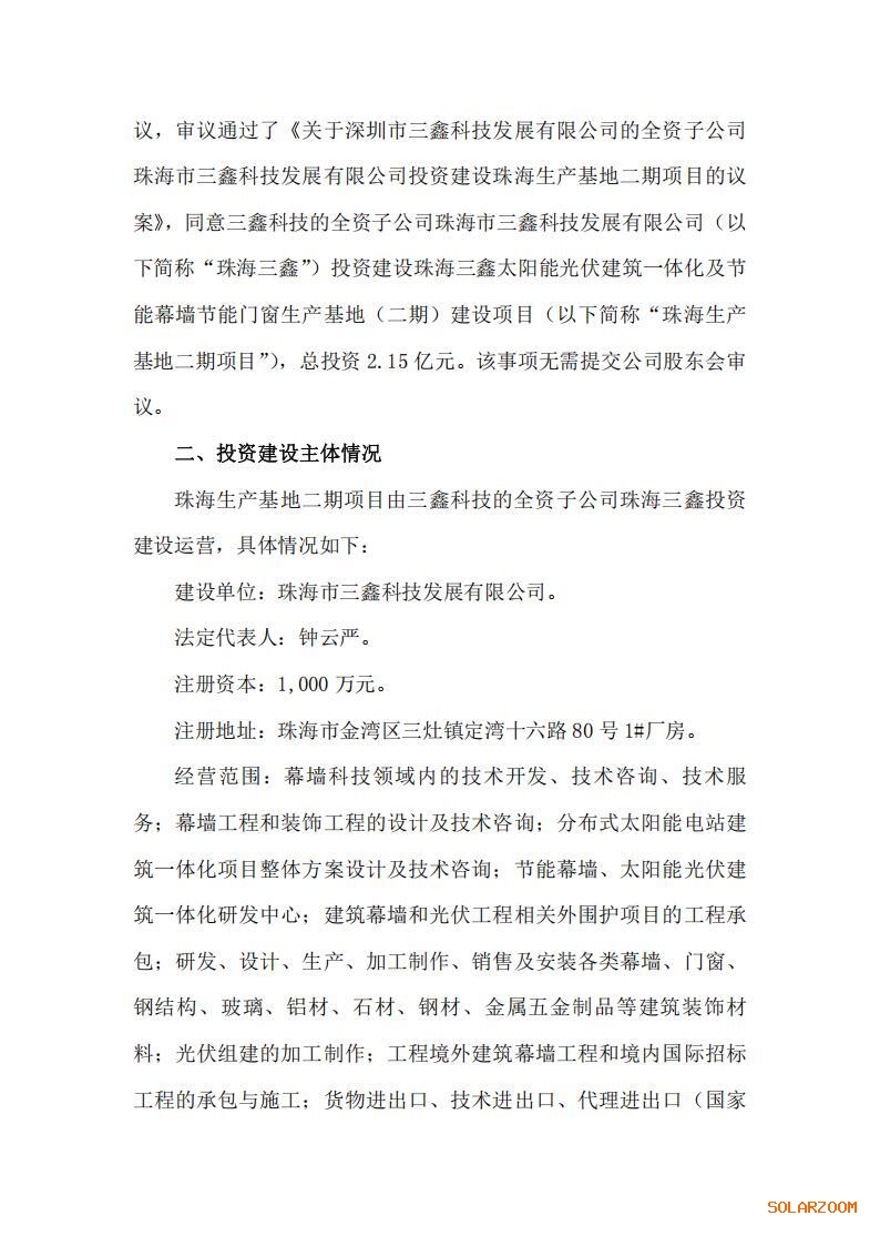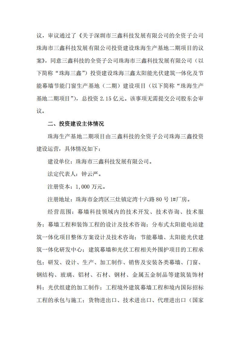 为提高珠海生产基地资源综合利用效率,扩大产能,做精做优幕墙业务,公司于 2025 年 12 月 12 日召开第八届董事会第三十次会议,审议通过了《关于深圳市三鑫科技发展有限公司的全资子公司珠海市三鑫科技发展有限公司投资建设珠海生产基地二期项目的议案》,同意三鑫科技的全资子公司珠海市三鑫科技发展有限公司(简称“珠海三鑫”)投资建设珠海三鑫太阳能光伏建筑一体化及节能幕墙节能门窗生产基地(二期)建设项目(简称“珠海生产基地二期项目”),总投资 2.15 亿元。