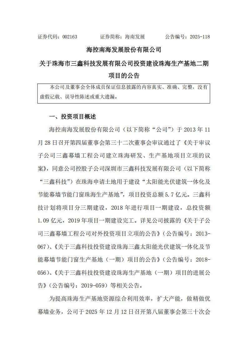 海控南海发展股份有限公司于 2013 年 11月 28 日召开第四届董事会第三十二次董事会审议通过了《关于审议子公司三鑫幕墙工程公司建立珠海研发、生产基地项目立项的议案》,同意公司控股子公司深圳市三鑫科技发展有限公司(简称“三鑫科技”)在珠海申请土地用于建设“太阳能光伏建筑一体化及节能幕墙节能门窗珠海生产基地”,项目投资总额 5.7 亿元。三鑫科技计划将项目分三期建设,2018 年进行项目一期建设,总投资额1.09 亿元,2019 年项目一期建设完工。