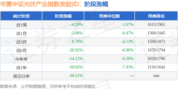 从业绩表现来看,华夏中证光伏产业指数发起式C基金过去一年净值涨幅为-30.02%,在同类基金中排名1516/1642,同类基金过去一年净值涨幅中位数为-7.93%。而基金过去一年的最大回撤为-37.6%,成立以来的最大回撤为-41.94%。