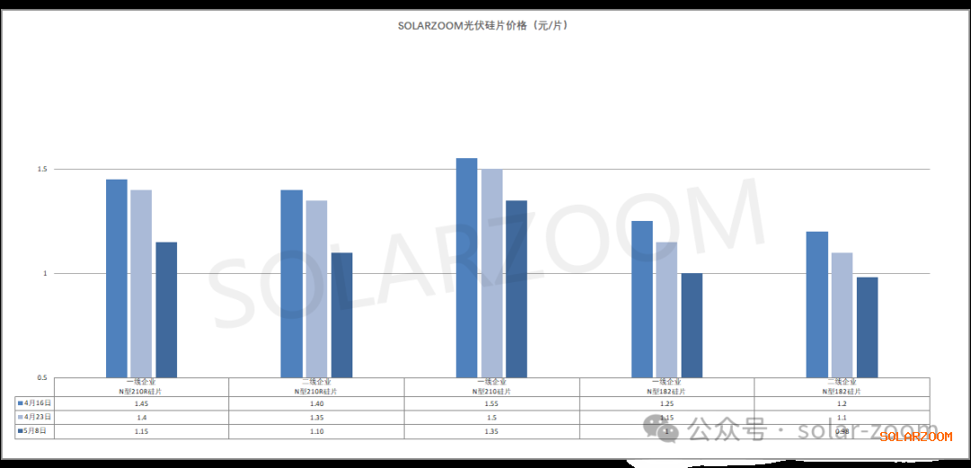 五一后下游终端需求锐减,市场氛围整体较为悲观,各尺寸硅片价格未能止跌,本周上来价格继续下行,部分尺寸硅片价格已至去年低位。本周N型M10L硅片价格包括硅片大厂在内价格来至1元/片,相比节前下跌0.05元/片左右,而在实际成交上价格仍有一定议价空间,0.9X元/片的实际成交有增多。N型210R硅片本周价格下跌来1.1-1.15元/片,价格进一步趋于价位区间的低位。N型210硅片价格相比其他尺寸硅片价格略显平稳,基本维持节前1.35元/片左右的价格。目前下游电池端环节价格仍在继续走跌,短期内在下游需求空窗期内硅片价格支撑力度仍显薄弱,但成本压力下硅片的可跌空间已较为有限;而叠加市场库存增加,而二季度硅片出货配额下调等影响,硅片企业的排产预计将会有调整。