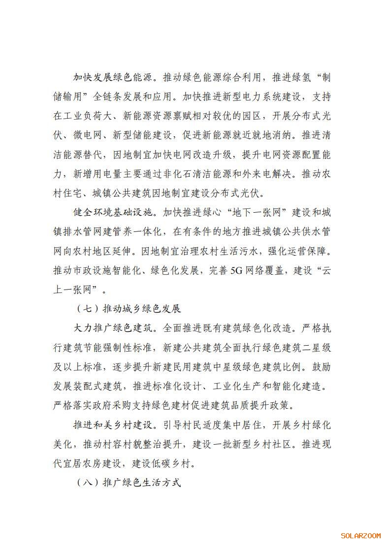 文件指出,加快发展绿色能源。推动绿色能源综合利用,推进绿氢“制储输用”全链条发展和应用。加快推进新型电力系统建设,支持在工业负荷大、新能源资源禀赋相对较优的园区,开展分布式光伏、微电网、新型储能建设,促进新能源就近就地消纳。推进清洁能源替代,因地制宜加快电网改造升级,提升电网资源配置能力,新增用电量主要通过非化石清洁能源和外来电解决。推动农村住宅、城镇公共建筑因地制宜建设分布式光伏。