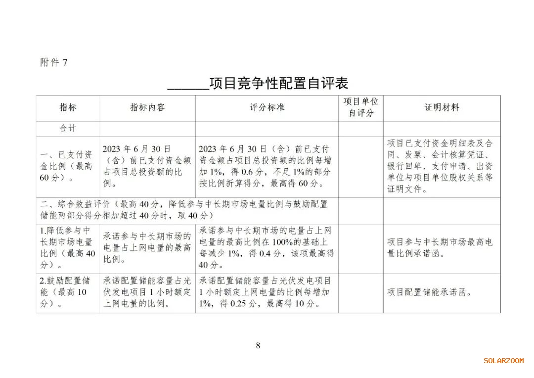 竞争性配置实行评分排序,分值满分100分,由已支付资金比例得分与综合效益评价得分构成。其中综合效益评价得分满分40分,由降低参与中长期市场电量比例和鼓励配置储能两部分相加组成,若两部分相加超过40分,按40分计。具体分值如下: