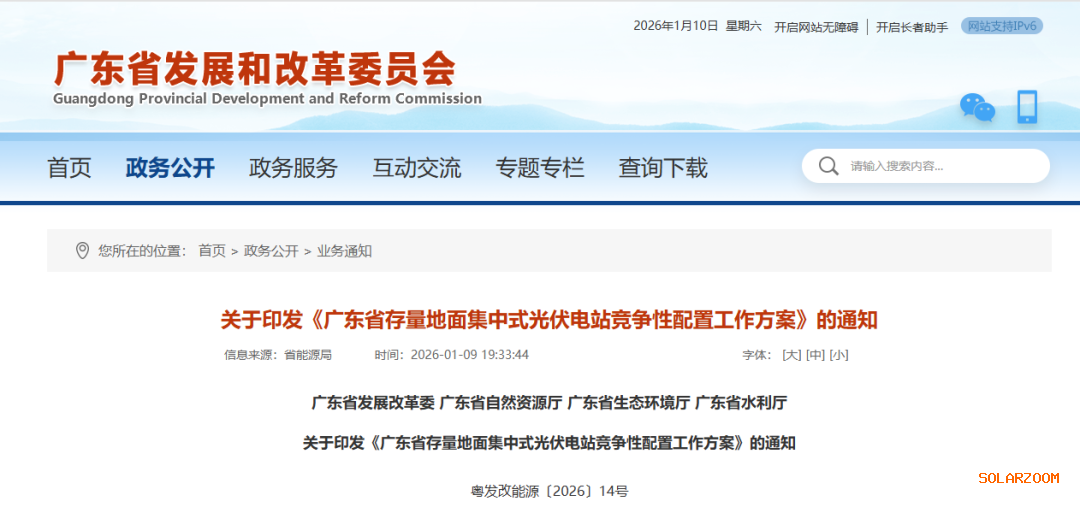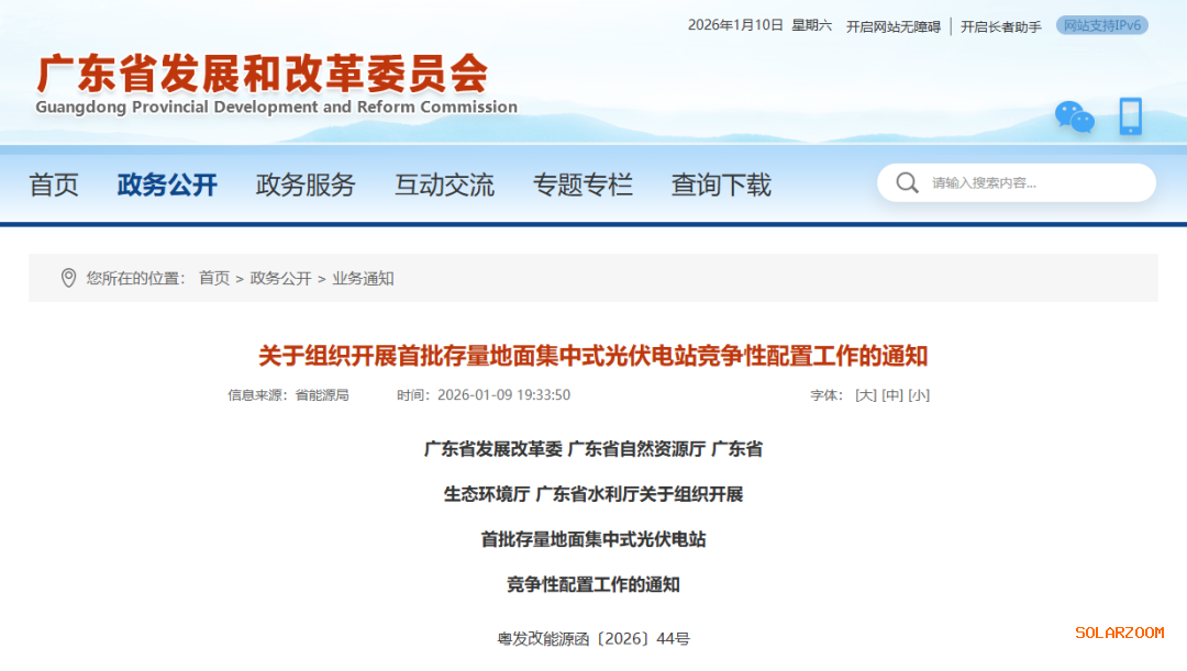 1月9日,广东省发展改革委、广东省自然资源厅、广东省生态环境厅、广东省水利厅联合发布《广东省存量地面集中式光伏电站竞争性配置工作方案》(粤发改能源〔2026〕14号),以及《关于组织开展首批存量地面集中式光伏电站竞争性配置工作的通知》(粤发改能源函〔2026〕44号)。