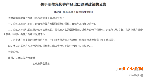 光伏要取消出口退税了,动力电池出口也紧随其后。根据税务总局发布的最新公告,从2026年4月1日起,中国光伏组件出口,出口退税直接归零,没有值增税补贴了。