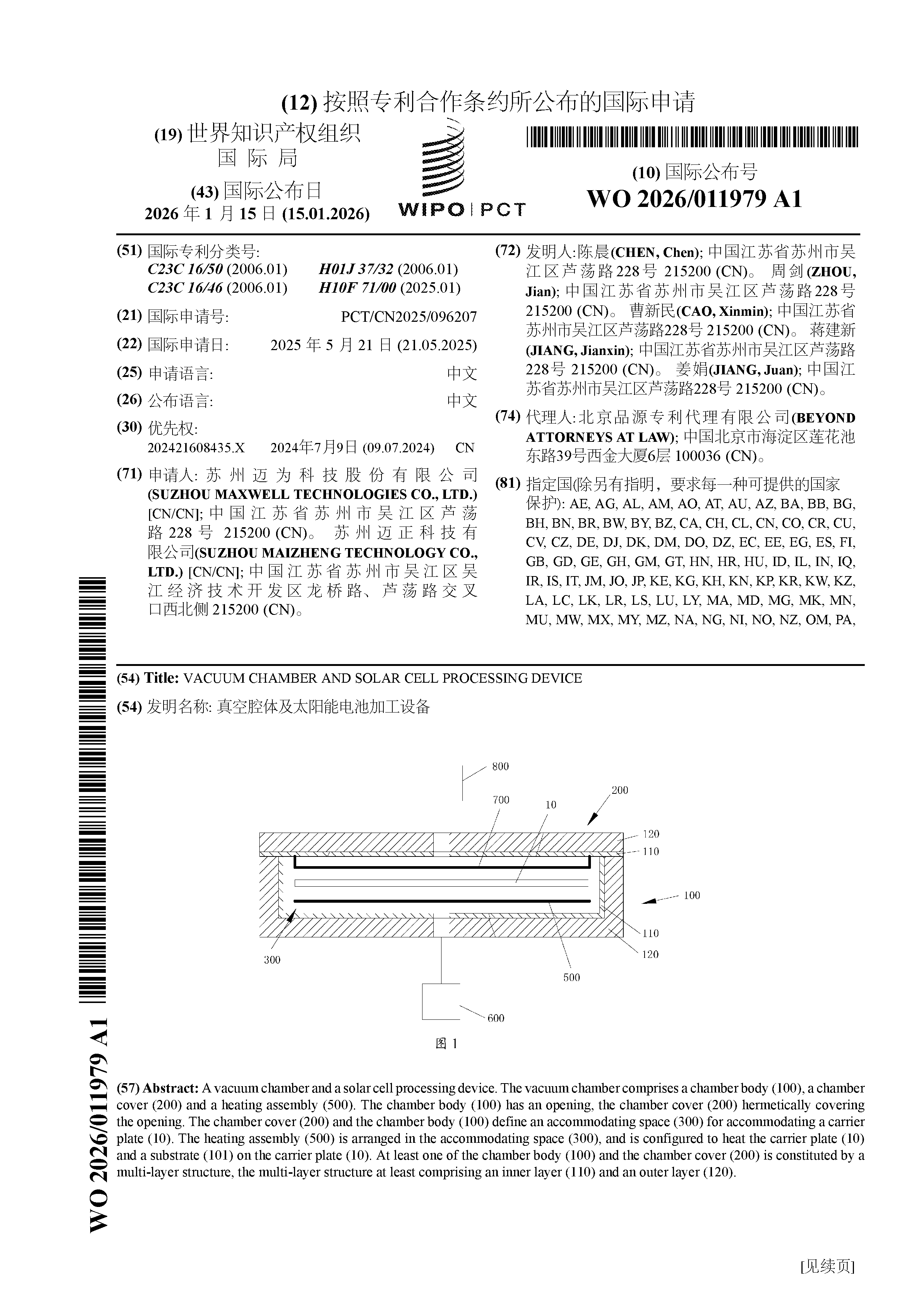 迈为股份公布国际专利申请:“真空腔体及太阳能电池加工设备”