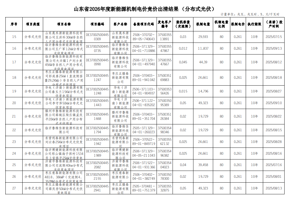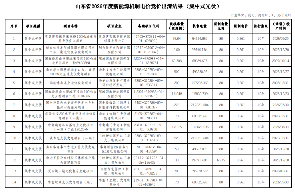光伏0.261元/度!山东2026机制电价竞价结果公示